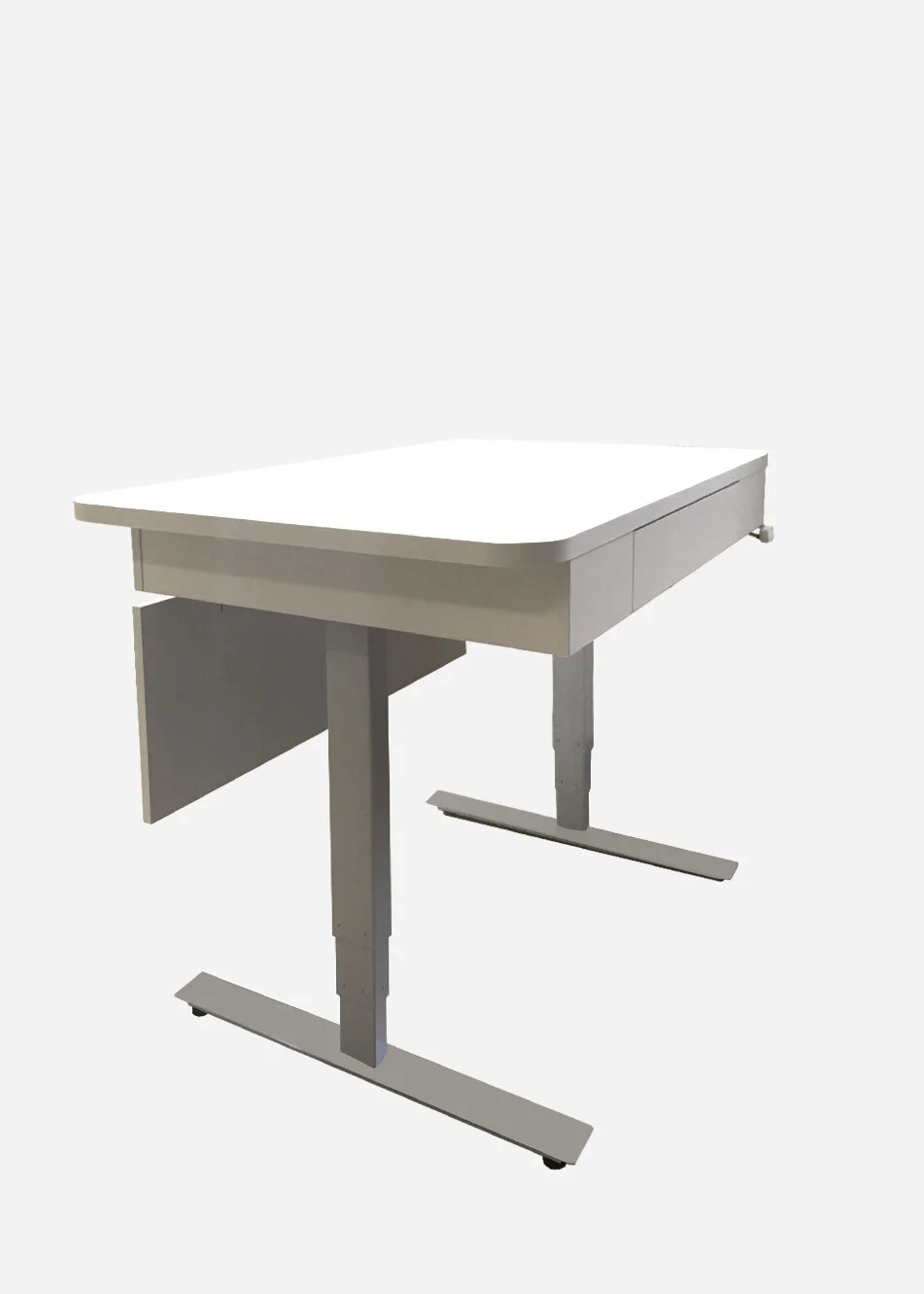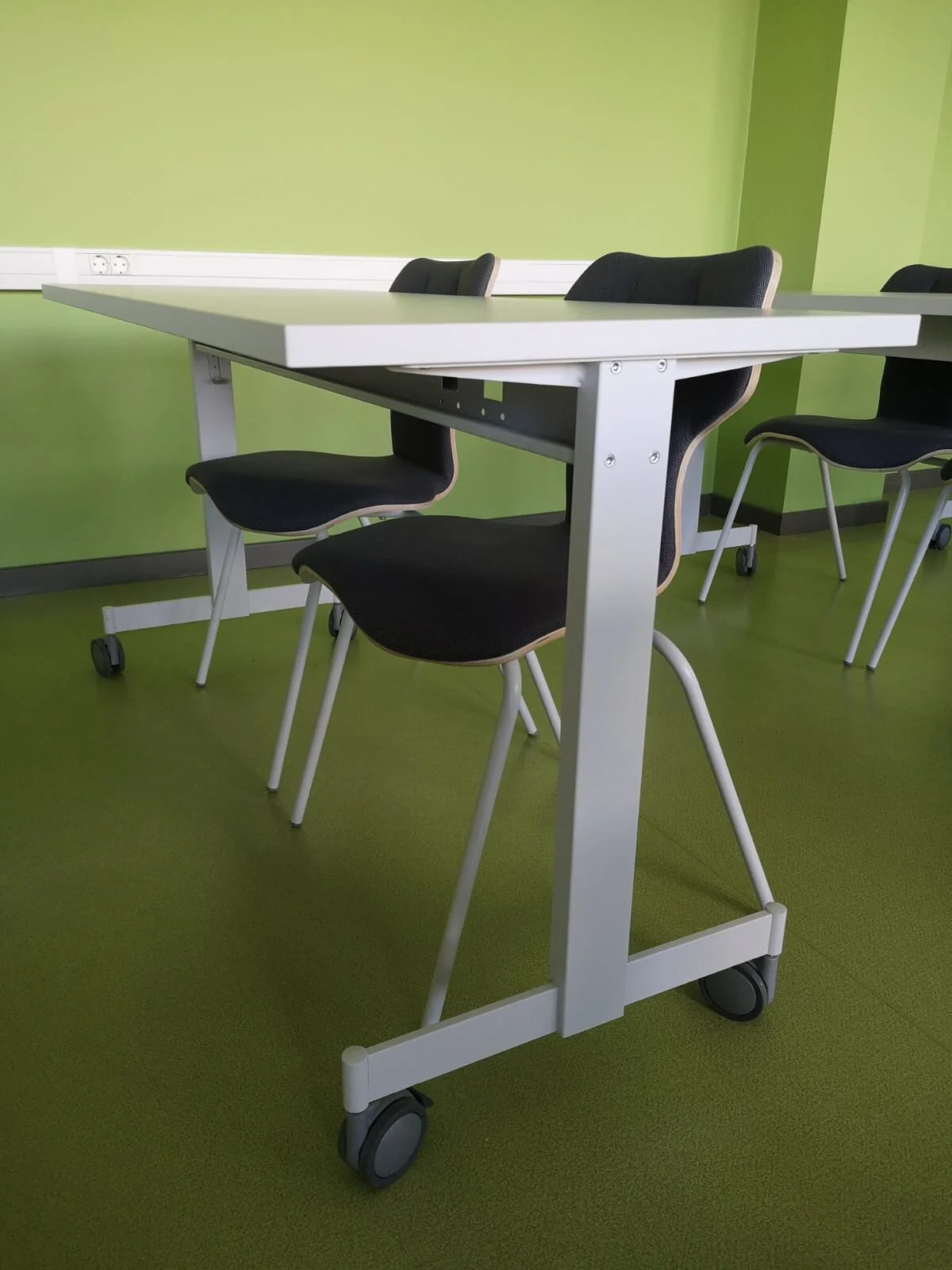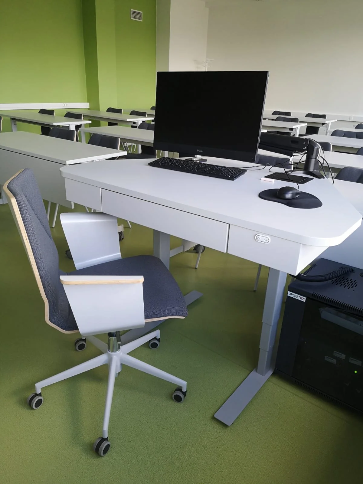 Pasniedzēja galds aprīkots ar pacelšanas mehānismu, lai pie galda varētu strādāt stāvus, kā arī ar vadības pulti projektoram, skaņai un pārējām nepieciešamajām funkcijām. Ražotājs - Rīgas Krēslu Fabrika.