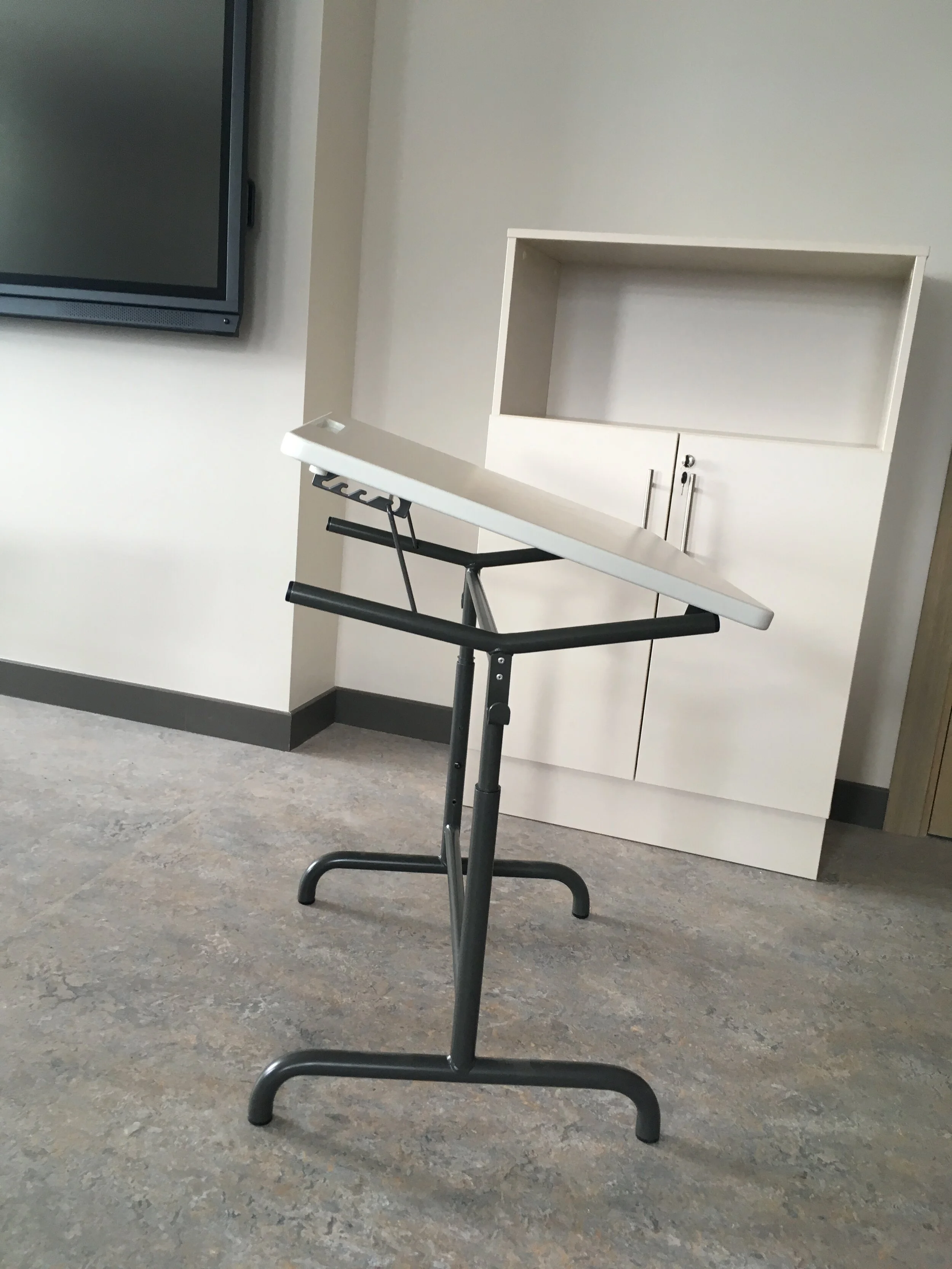 Īpašs galda virsmas pacelšanas mehānisms ļauj mainīt virsmas slīpumu attiecībā pret lietotāju.